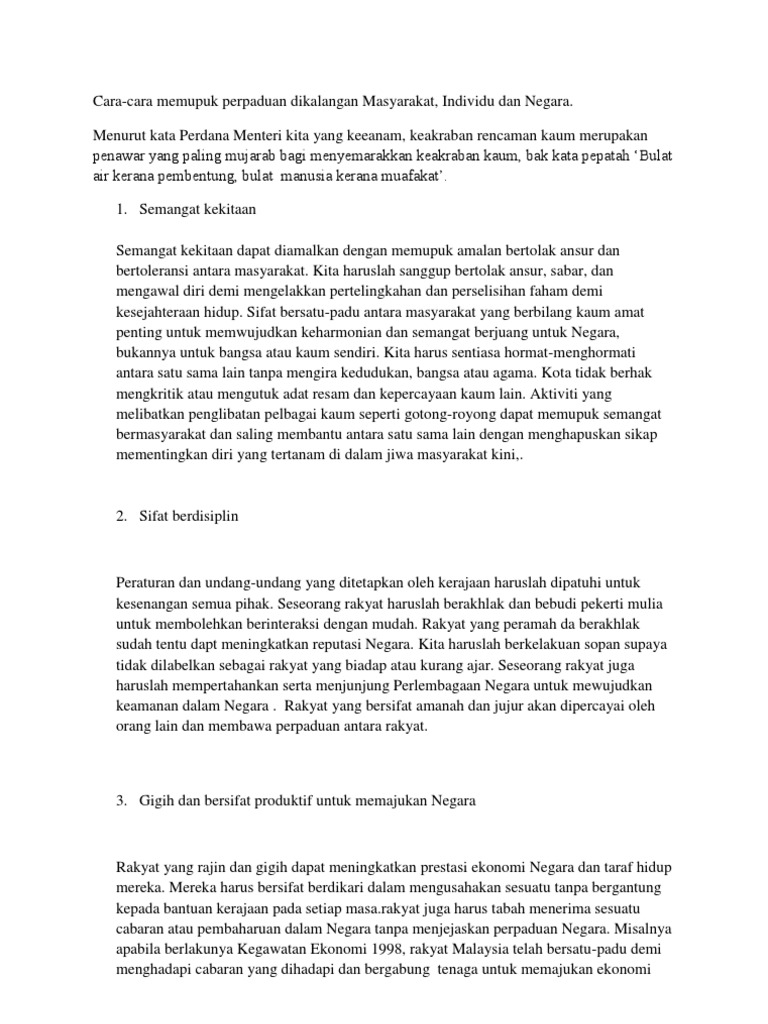 Cara Memupuk Perpaduan from imgv2-2-f.scribdassets.com Contoh karangan bahagian a spm. Kitalah yang akan menjadi pendukung untuk mencapai perpaduan negara atau integrasi nasional demi mewujudkan kesejahteraan sosial. Masyarakat mengelak daripada menimbulkan sesuatu yang sensitif kepada sesuatu kaum. Permainan tradisional di negara kita. Contoh karangan bahasa melayu spm peranan remaja dalam membangunkan dan memajukan negara ini. 'bagai aur dengan tebing' merupakan peribahasa yang amat sinonim dengan kehidupan masyarakat malaysia. Lihat gambar di bawah dengan teliti. Sebenarnya, amalan rumah terbuka yang diwujudkan banyak memberikan kemaslahatan terutamanya dalam mengeratkan perpaduan kaum dalam kalangan anggota masyarakat di negara kita.